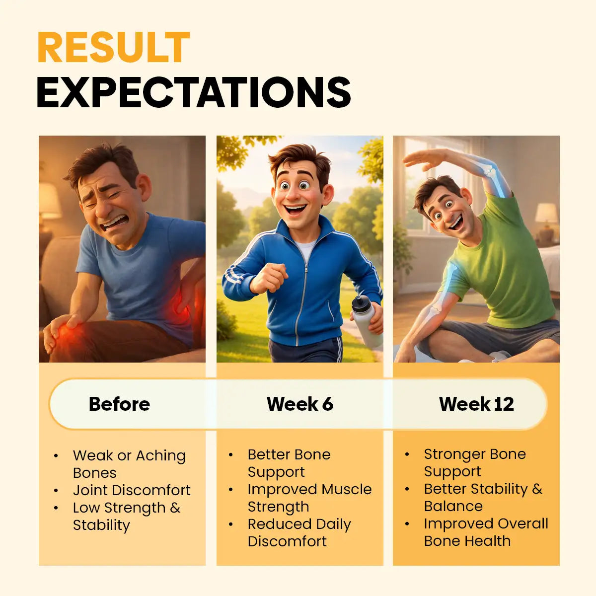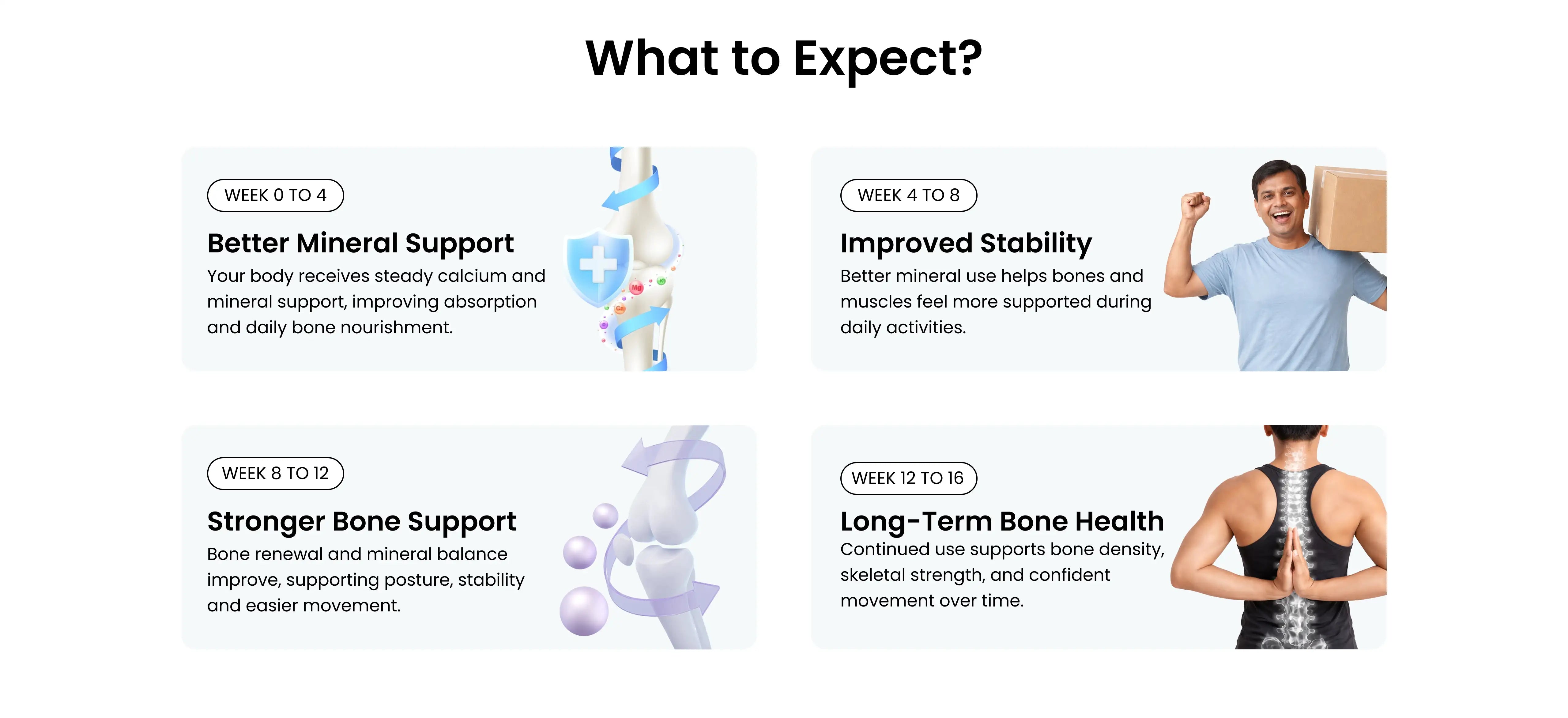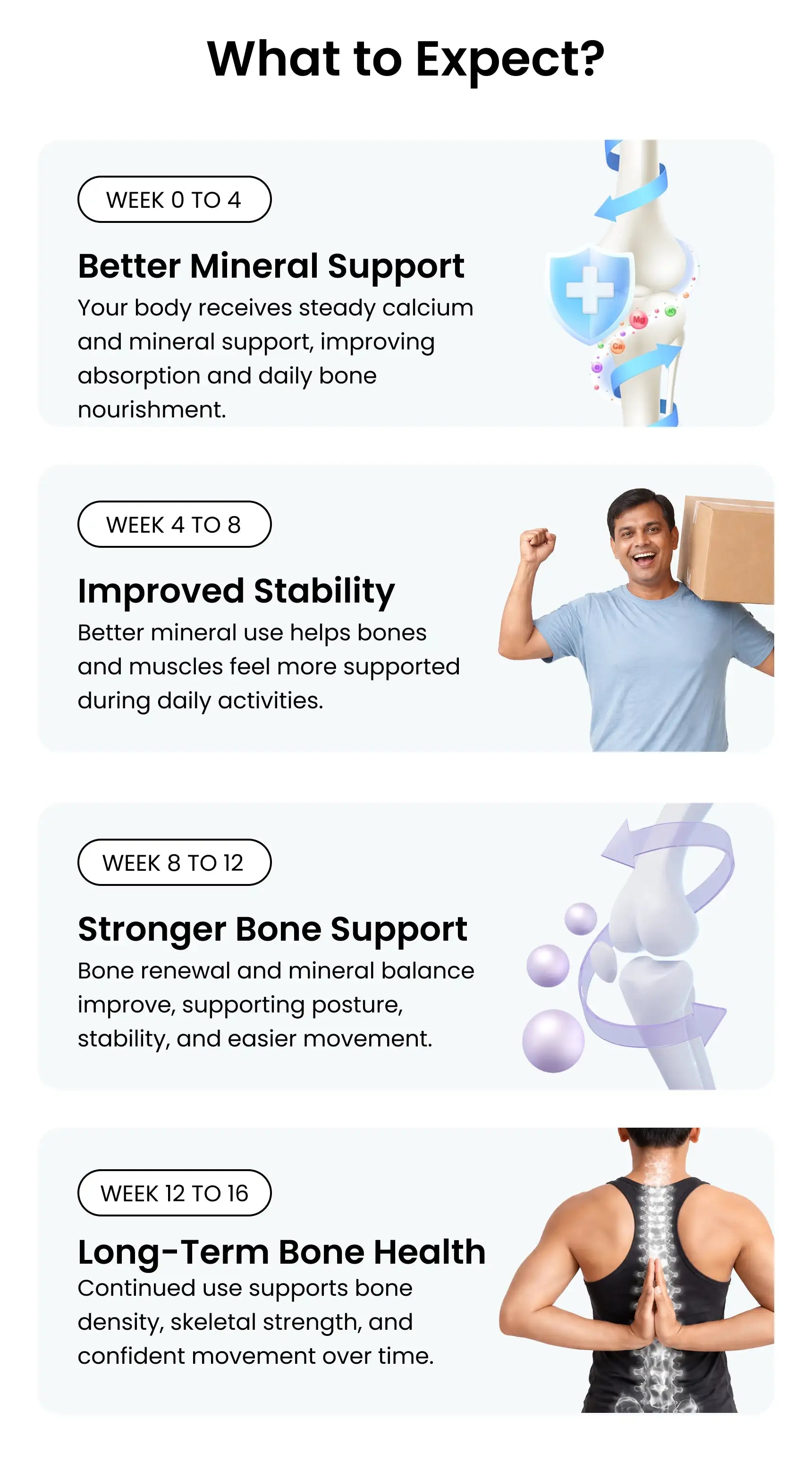 Some people notice better bone support within 3–4 weeks. For best results, use consistently for at least 3 months.