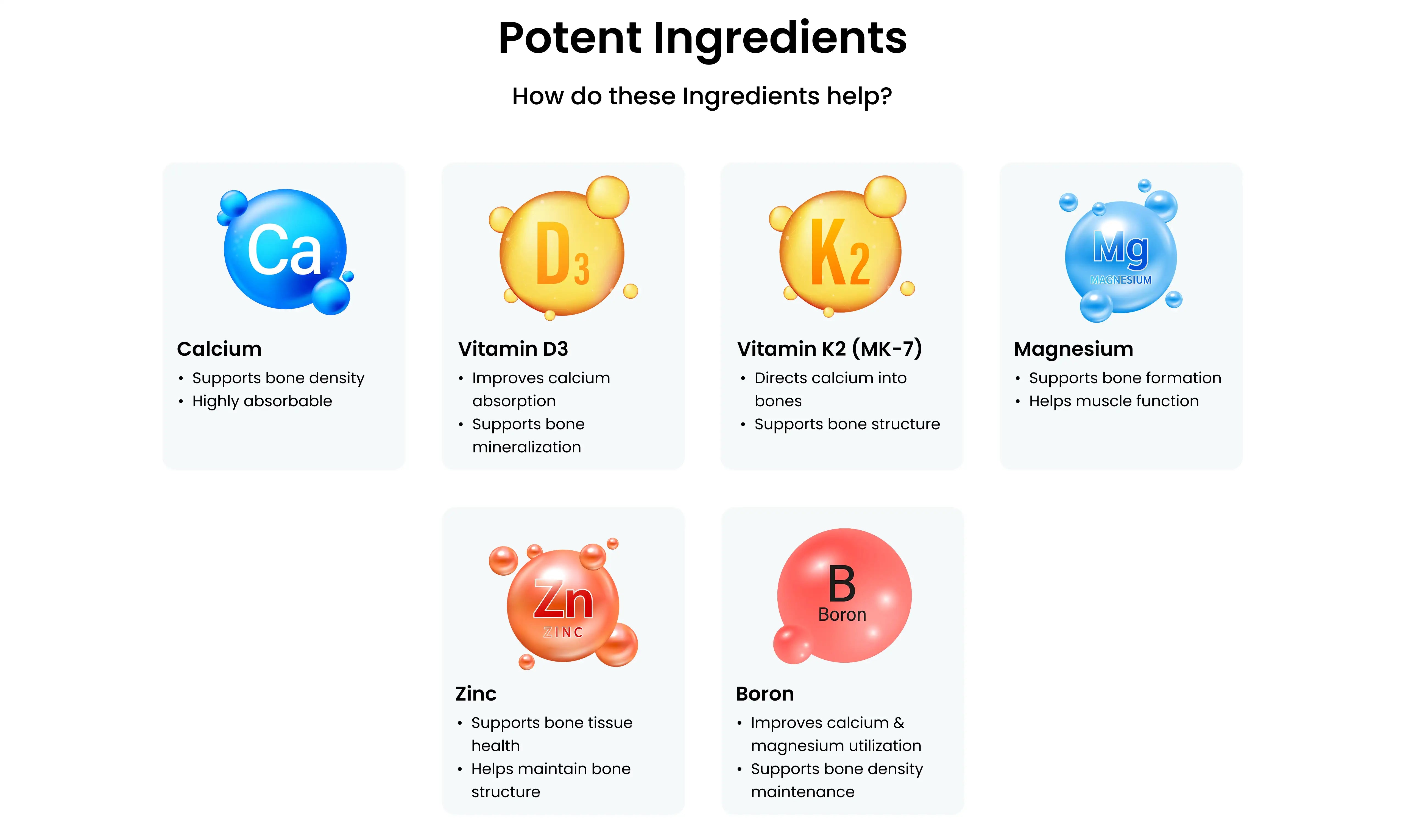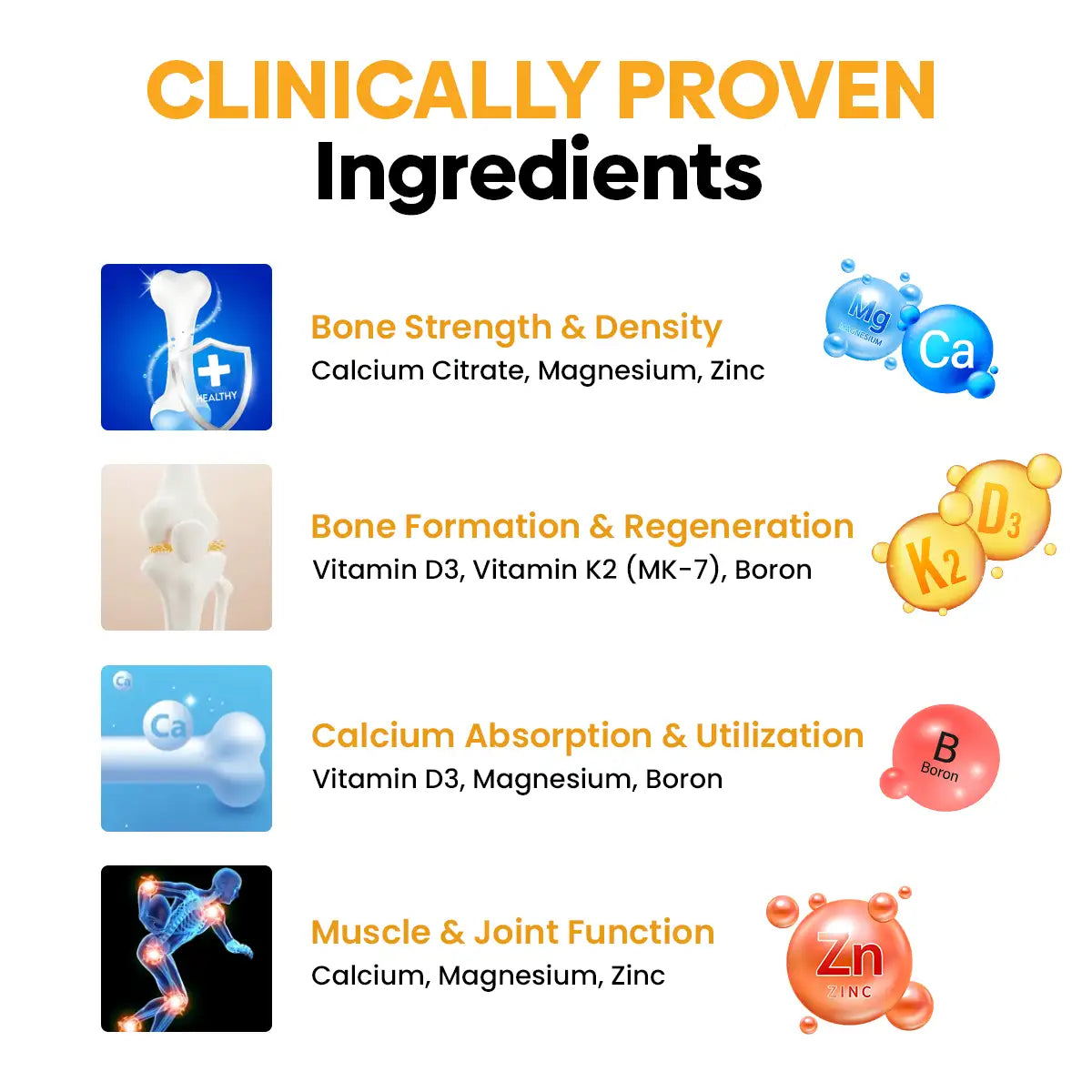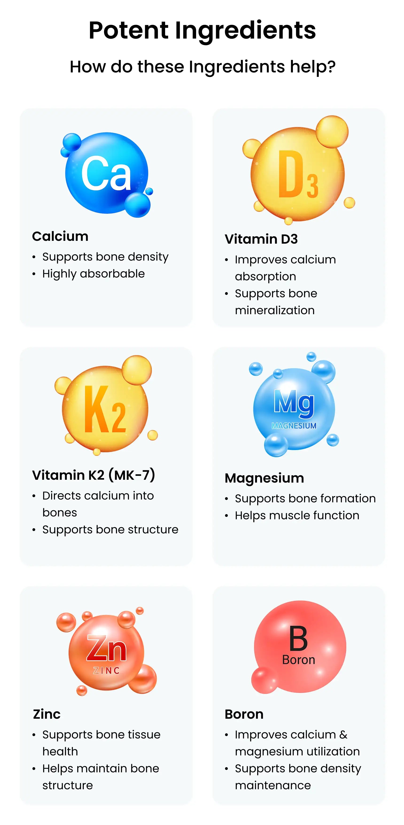 Calcium Citrate Tetrahydrate, Starch, Magnesium Oxide, Colour Titanium dioxide (INS 171), Talc ((INS 553(iii)), Zinc Gluconate, Magnesium Stearate, Boron (as Boron Proteonate), Preservatives- MPS(INS 219), PPS(INS 217), Vitamin K2(MK-7)(Menaquinone), Vitamin D3 (Cholecalciferol).