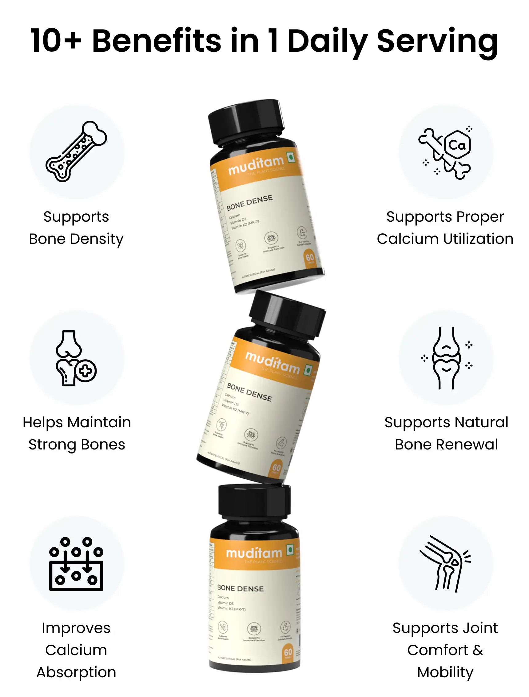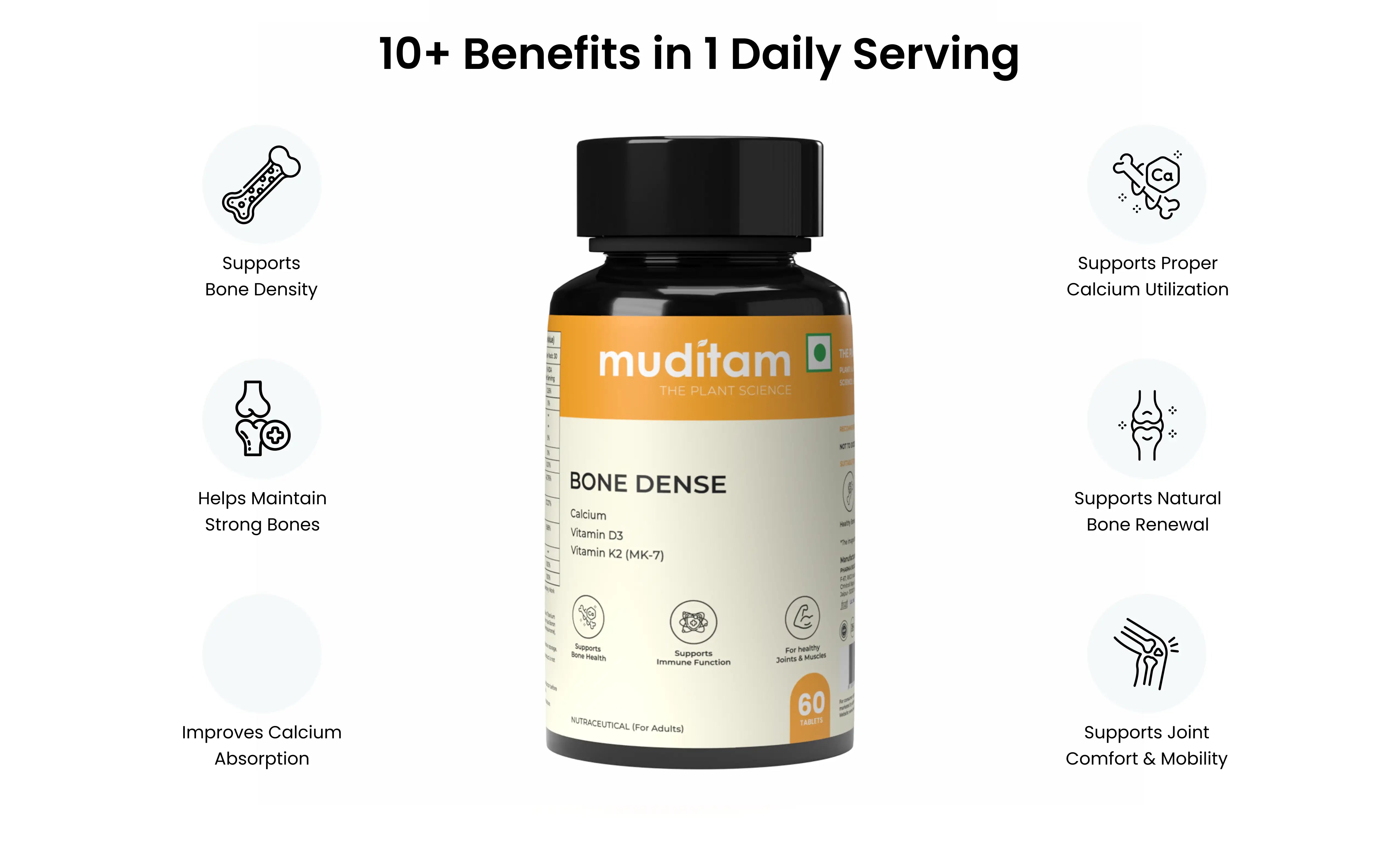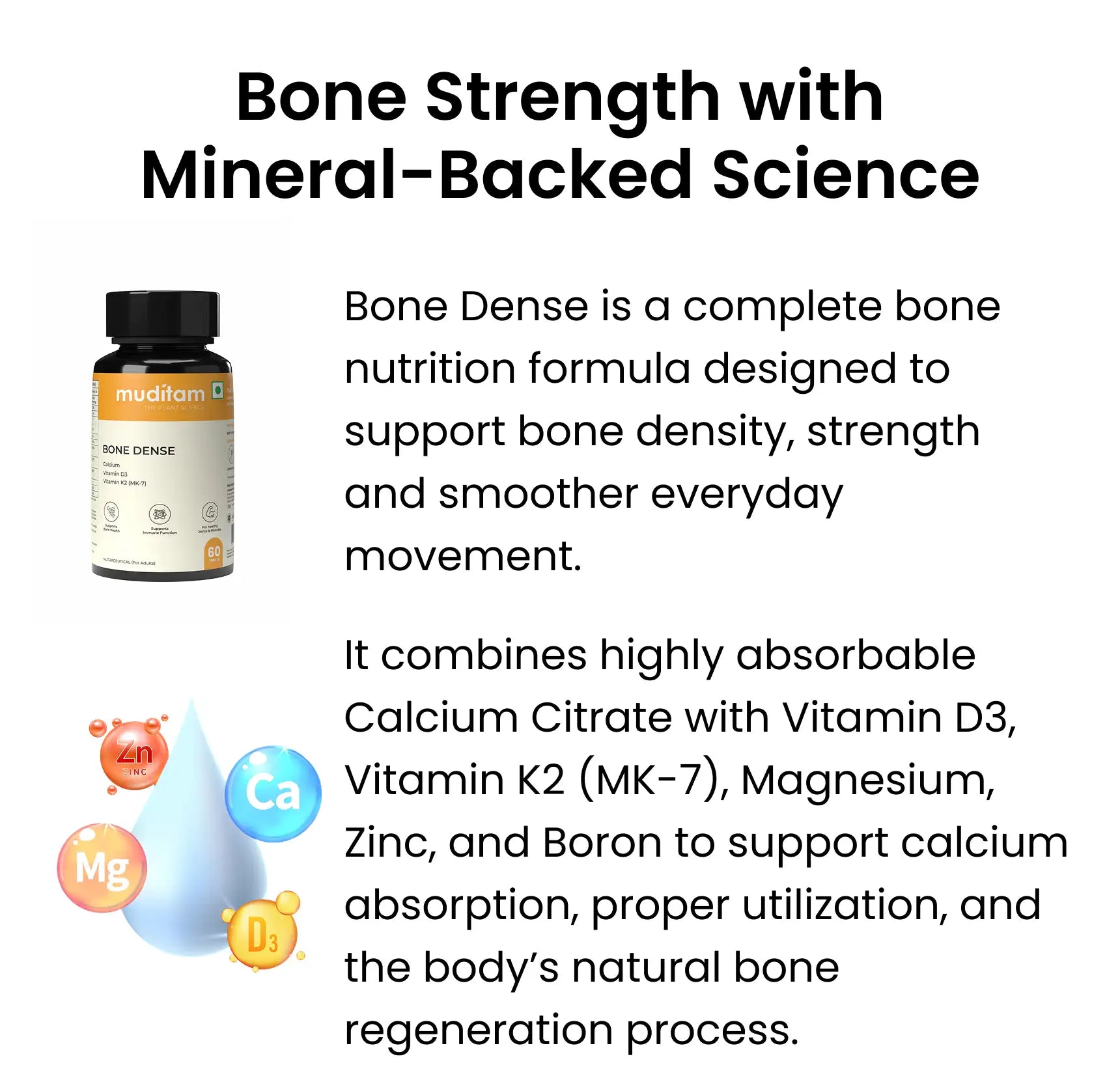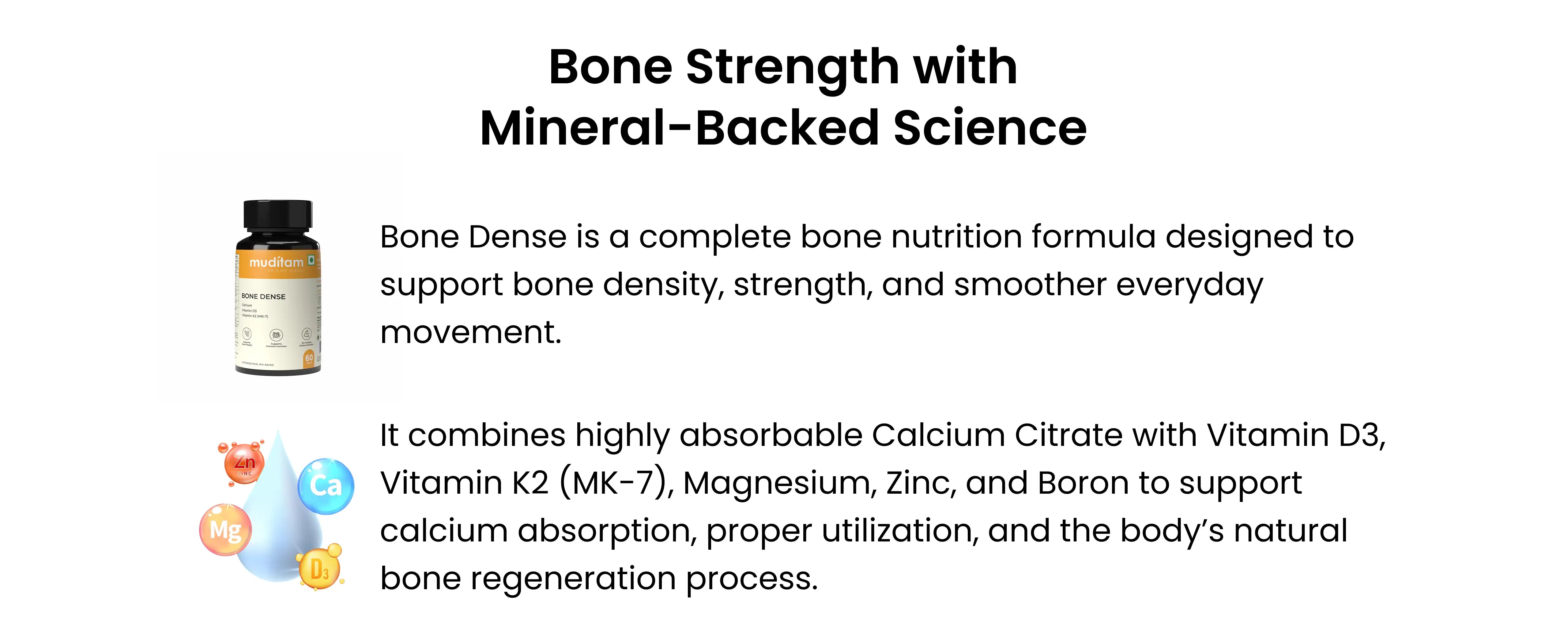 Bone Dense combines highly absorbable calcium with supporting nutrients that help improve mineral utilization and bone nourishment. This balanced formulation supports bone density, skeletal strength, and long-term bone health - especially in age-related or diabetes-associated bone loss.