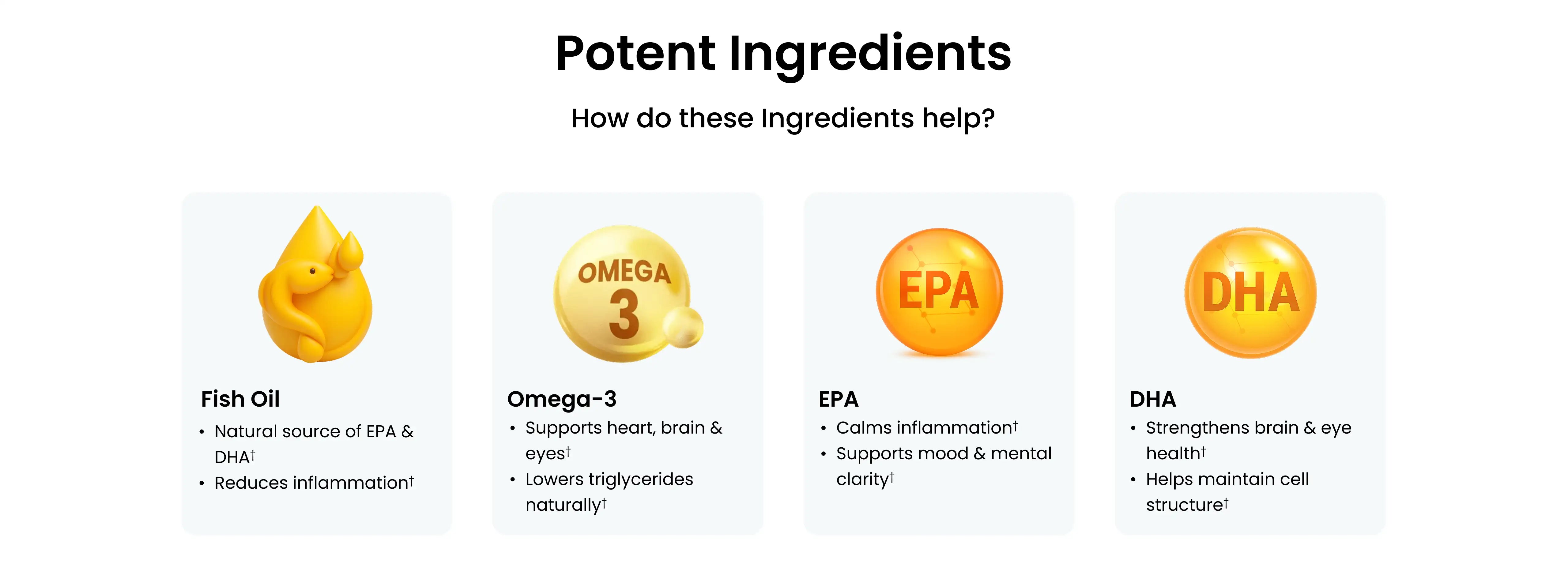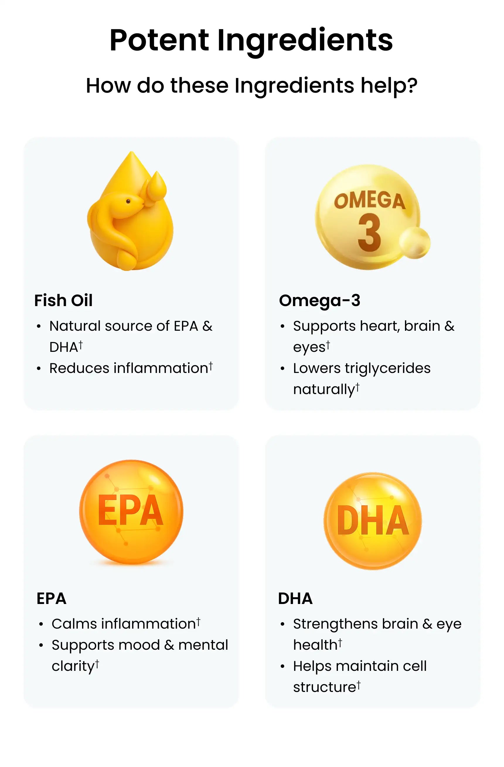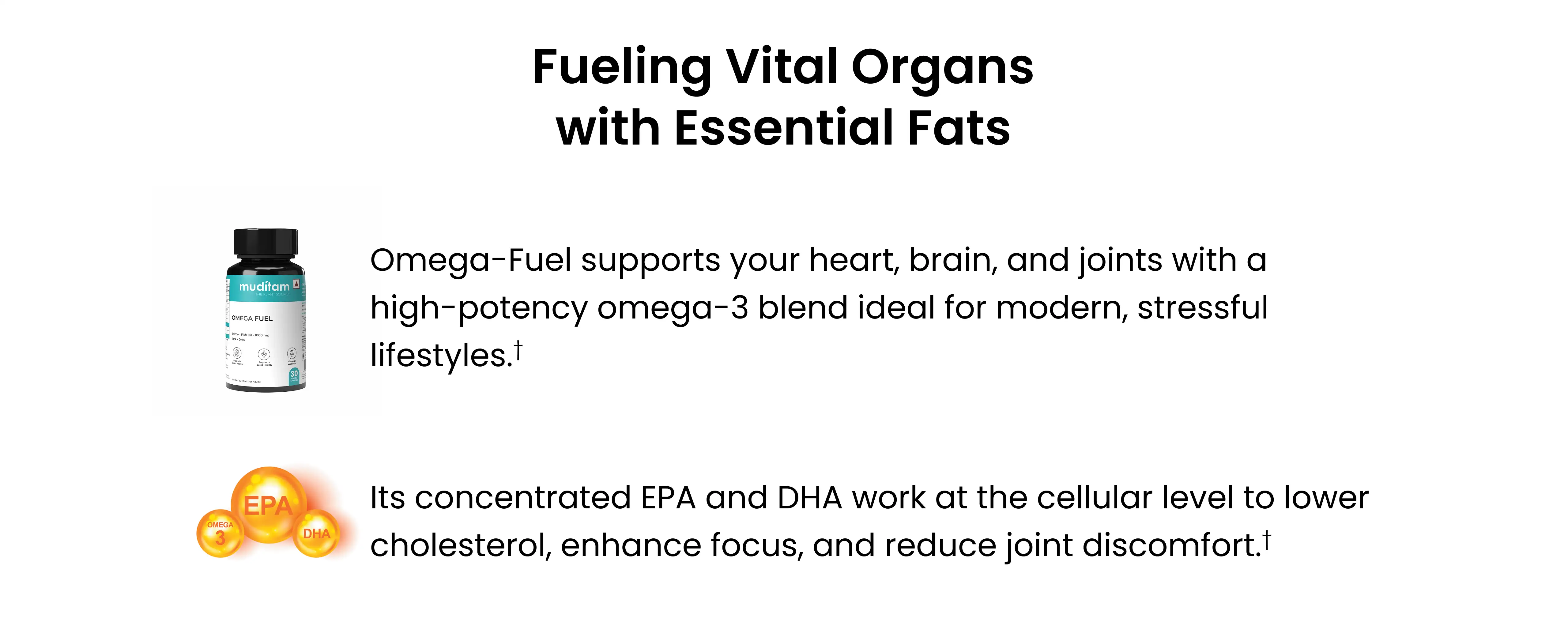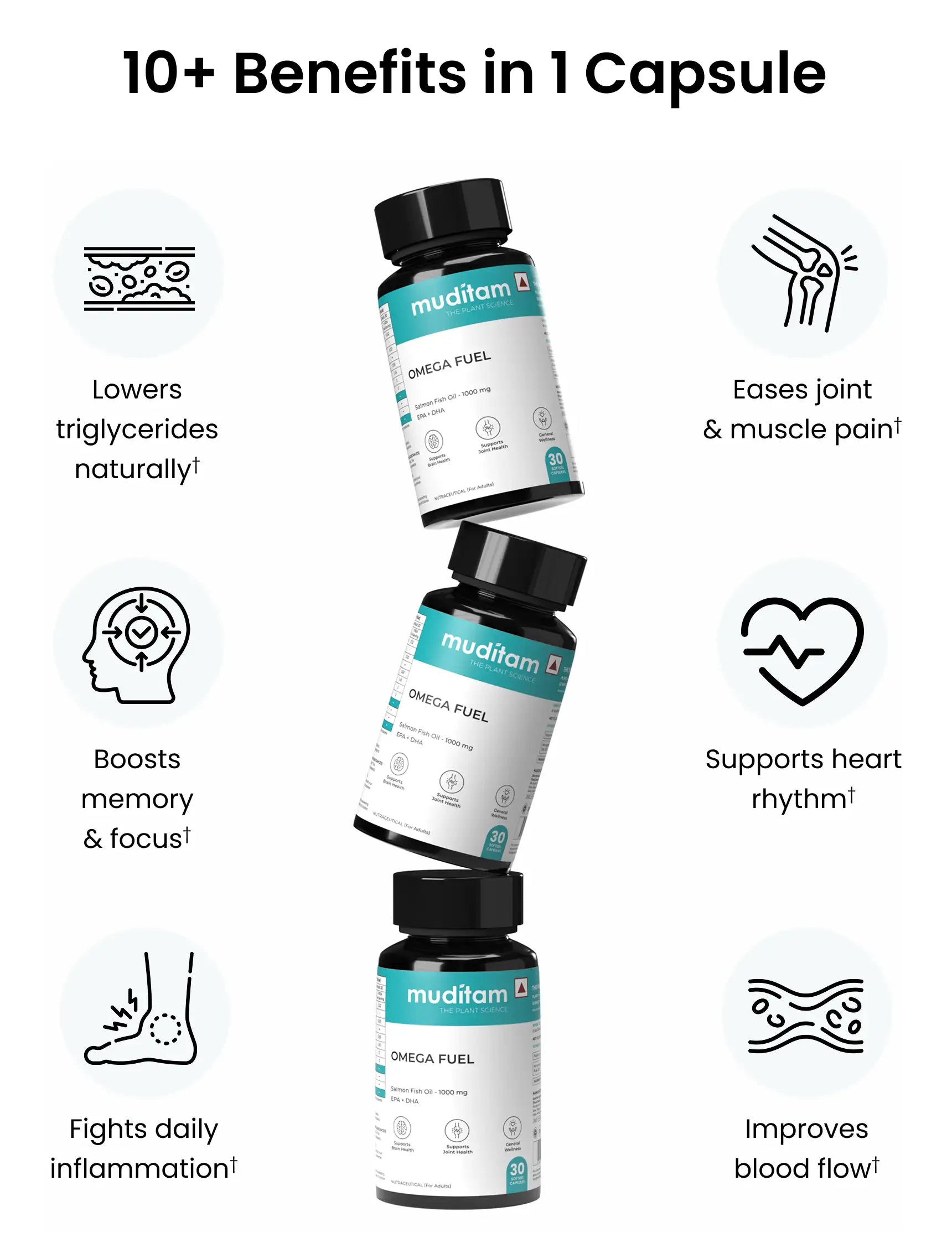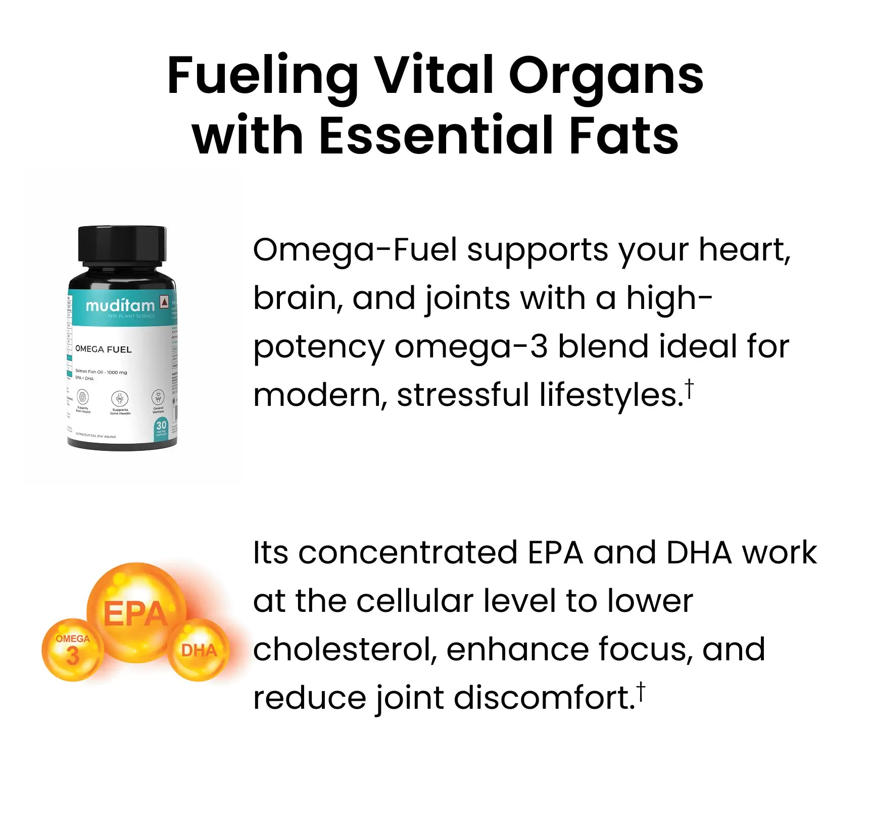 Omega Fuel provides a concentrated source of EPA and DHA - the key omega-3 fatty acids known to support heart, brain, and joint health. Its formulation is designed for better absorption compared to standard fish oil supplements.