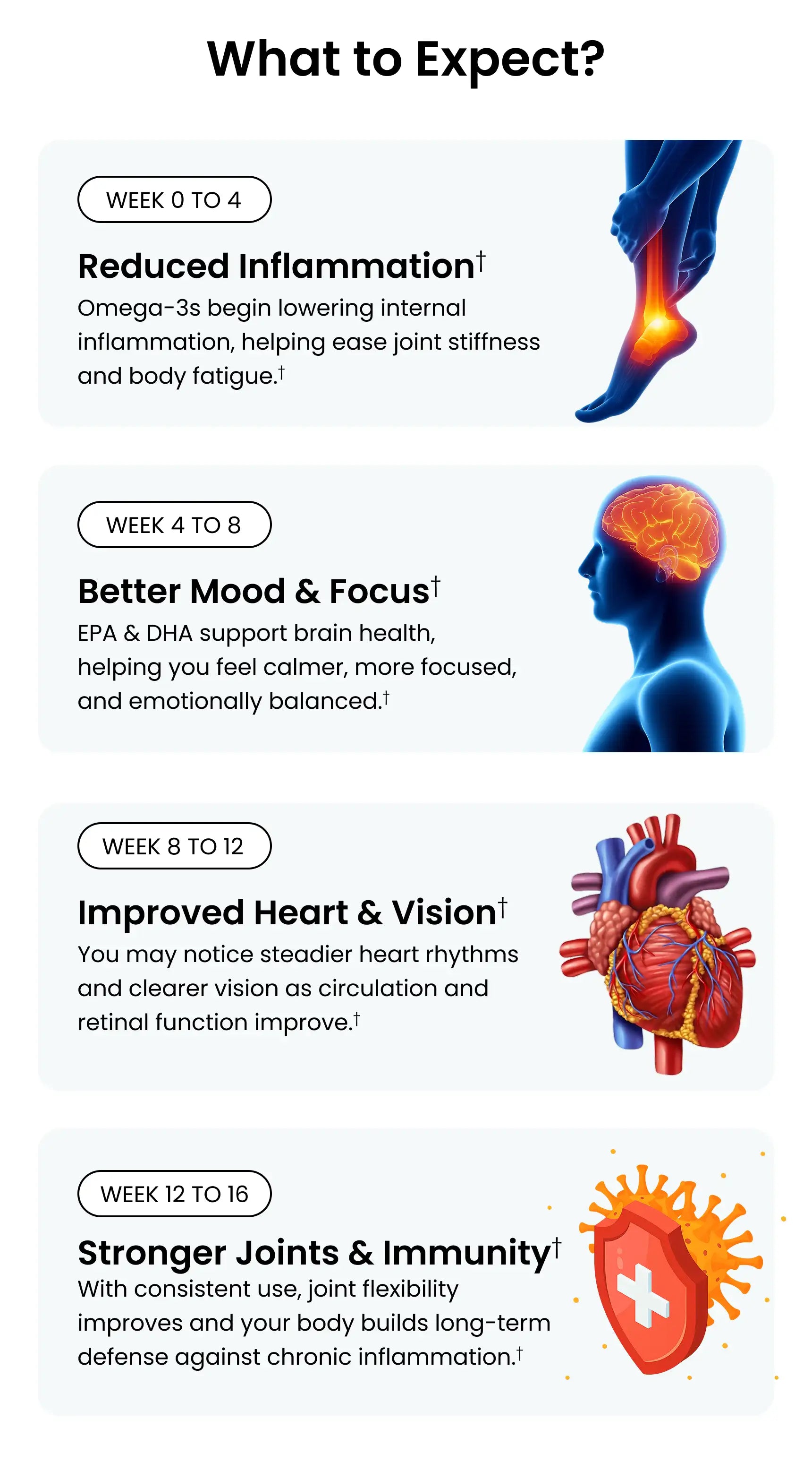 Results may vary depending on your individual health, lifestyle, and diet. Some people may begin to notice changes such as improved joint comfort within a few weeks, while overall wellness benefits generally require consistent use over a longer period.